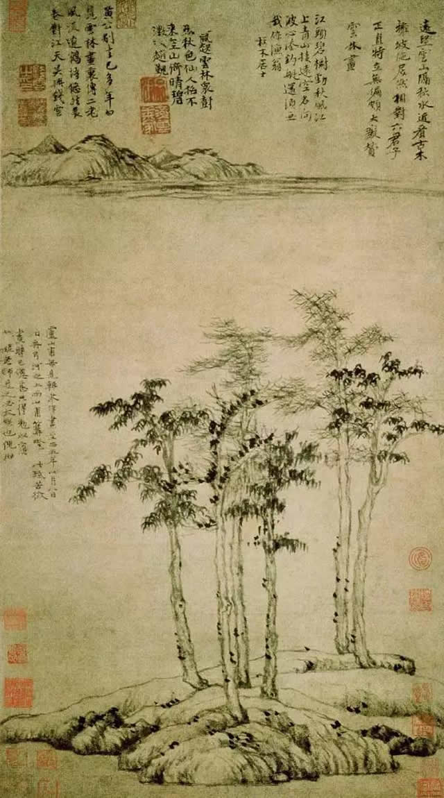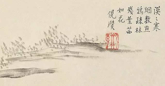 倪瓒的画寒烟清静,很少有人,他宁愿偏执地画上一堆点。