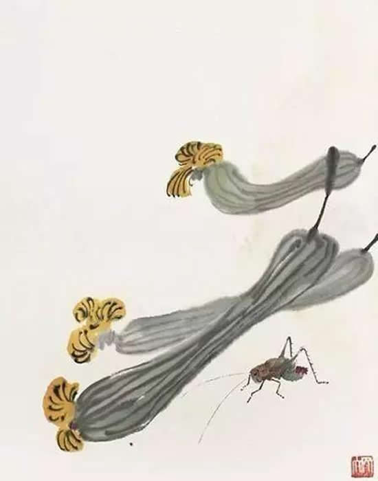 潘天寿《数日雨晴秋草长,丝瓜沿上瓦墙生》