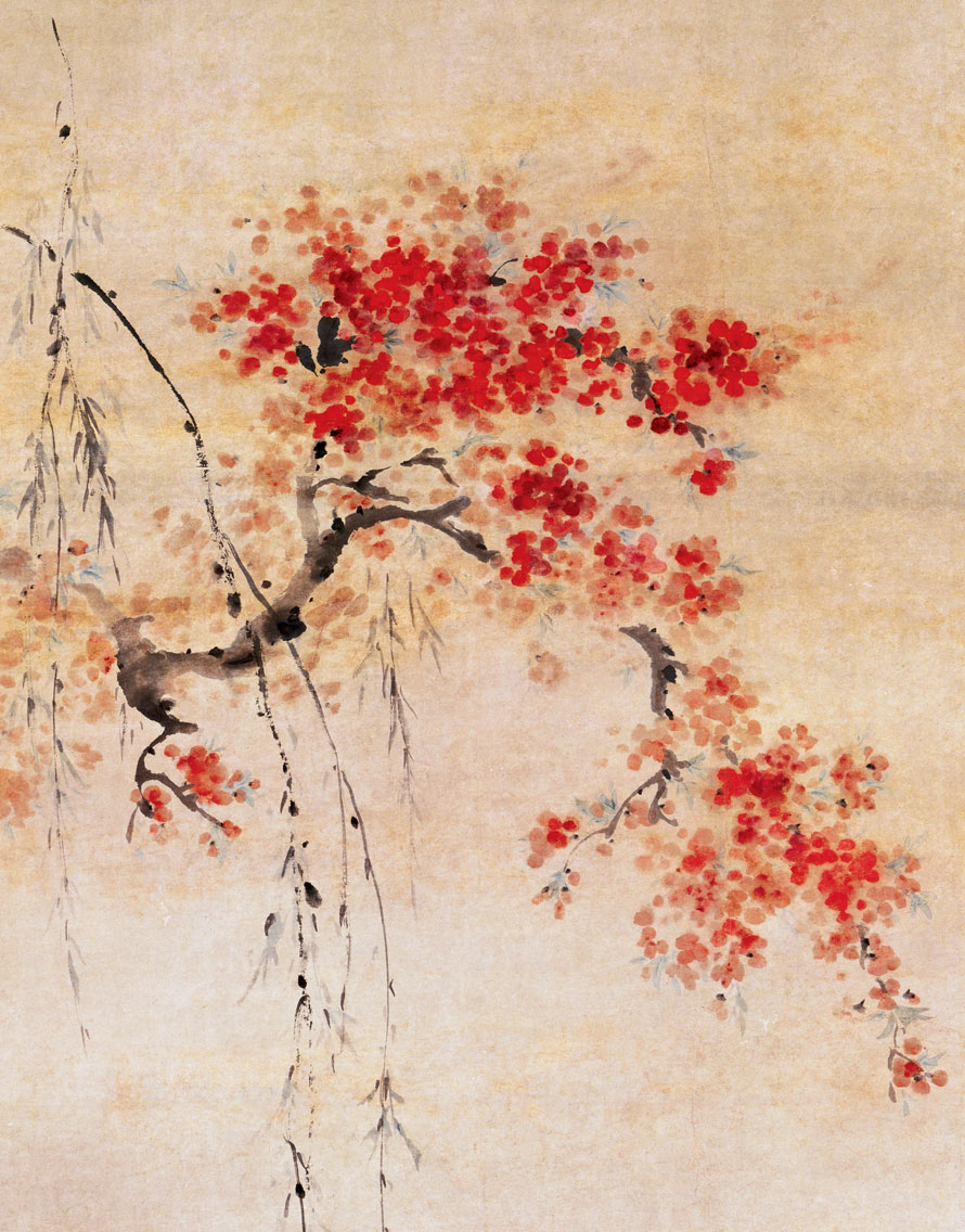 《桃潭浴鸭图》是华嵒61岁时所绘。图中虬曲的桃树枝干上,粉红色的桃花俯仰生姿,宛若锦绣,三两枝初生嫩叶的柳条垂落在清澈见底的潭水之上,随风摆动的柳梢不断触动水面而泛起涟漪,引得潭中野鸭回首注目。