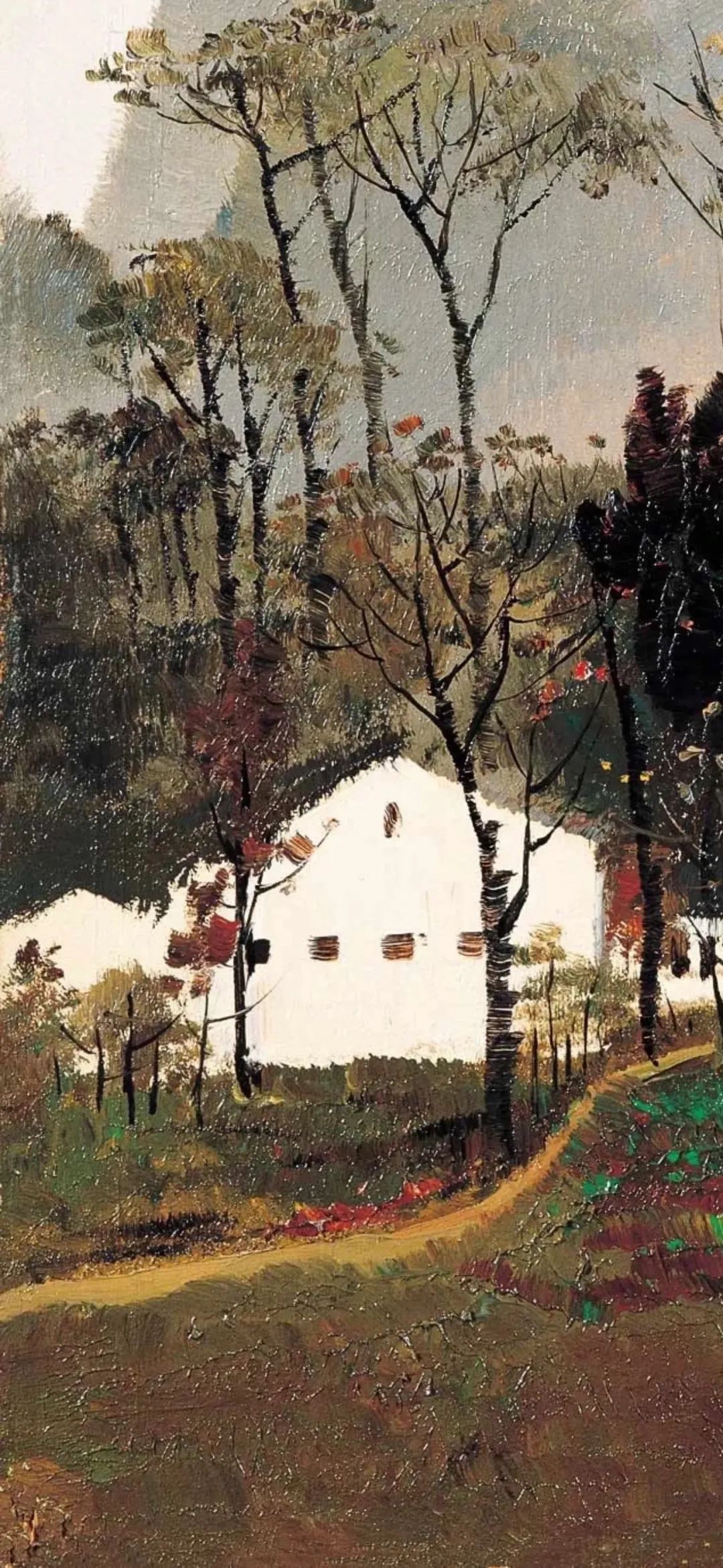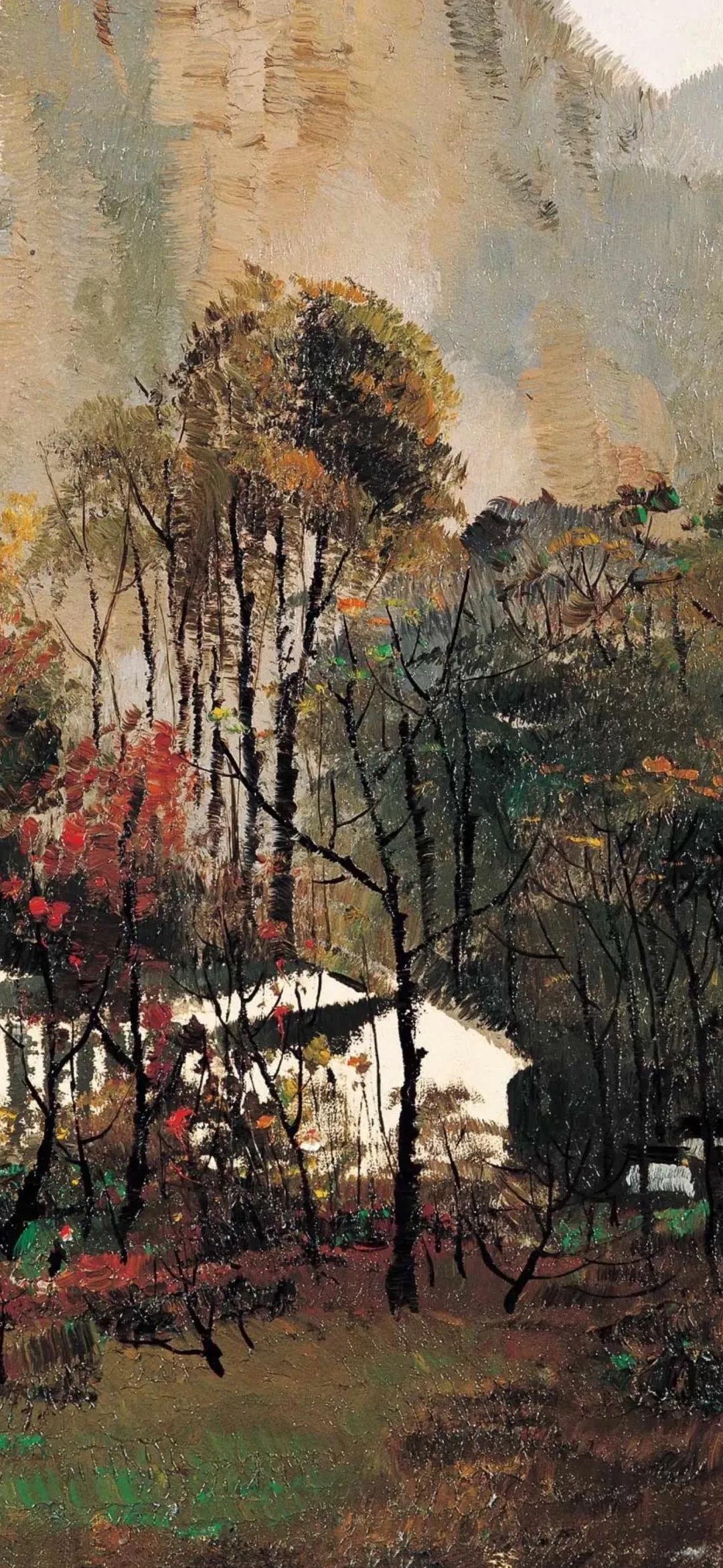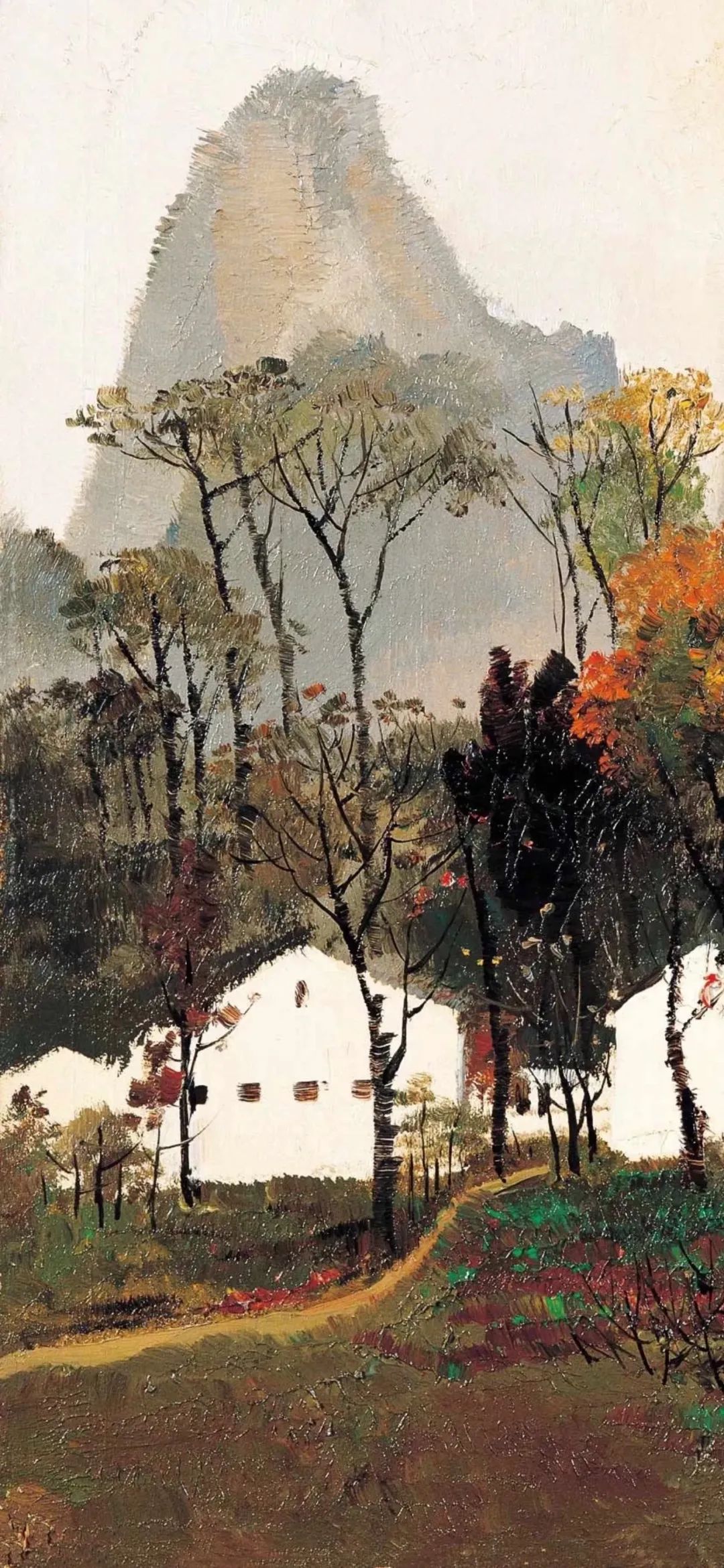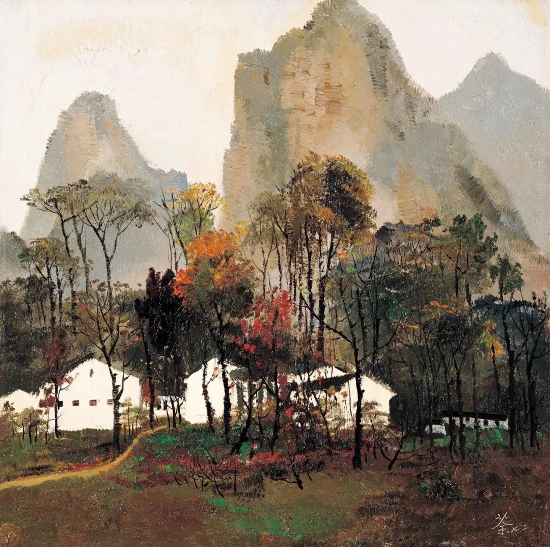吴冠中创作了大量描绘江南白墙灰瓦的建筑和苏杭园林的油画作品。无论是《桂林山村》中山峦掩映的民居,还是《水上人家》里临水的小村落,或是《绍兴河浜》中沿着狭窄曲折的河道一路排列的房屋,都表达了对江南家乡浓浓的热爱和怀念。