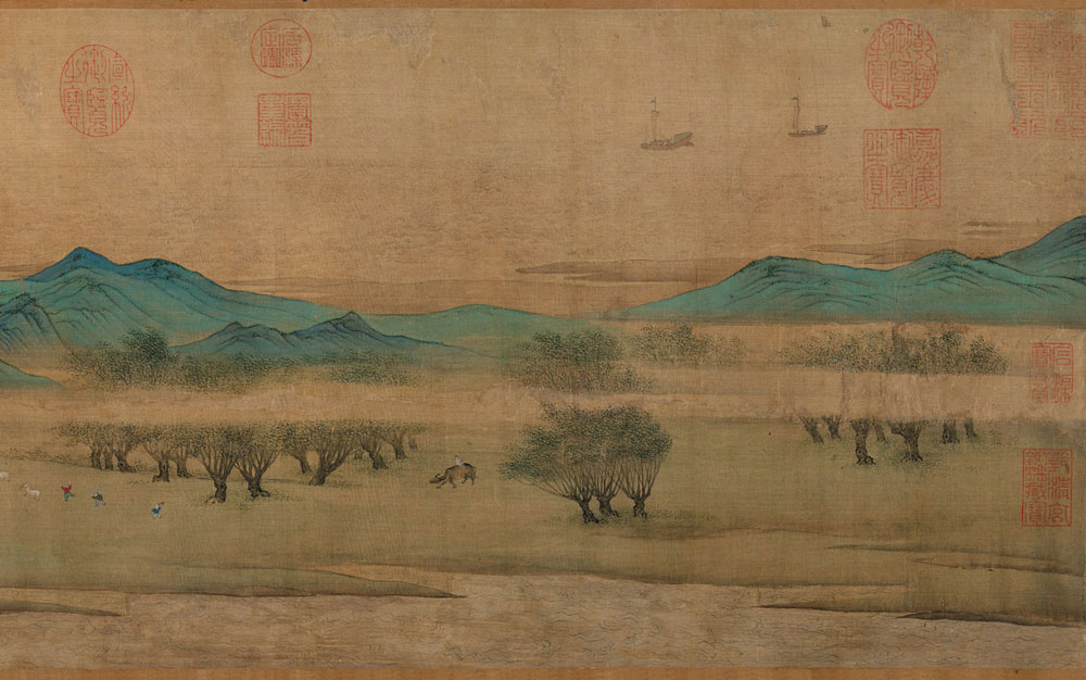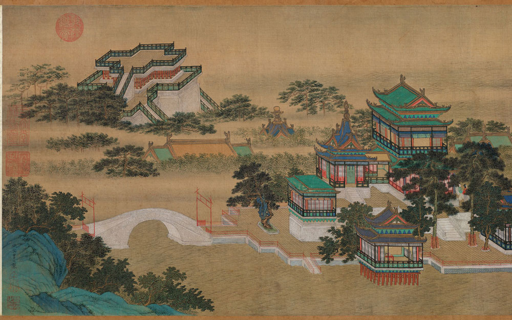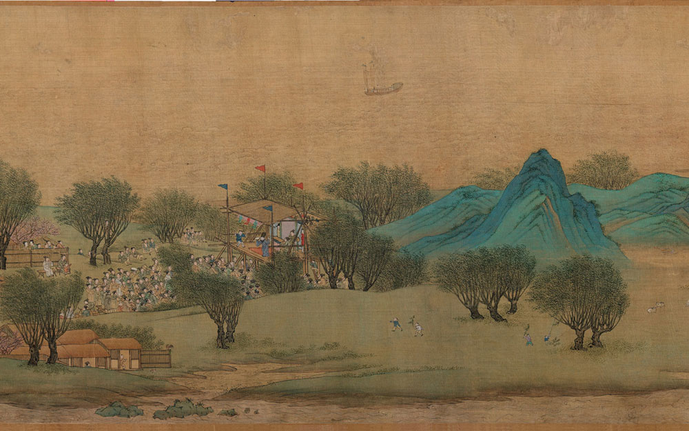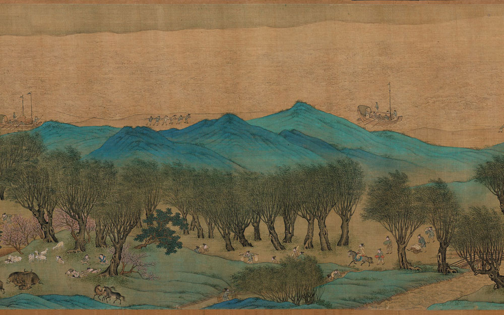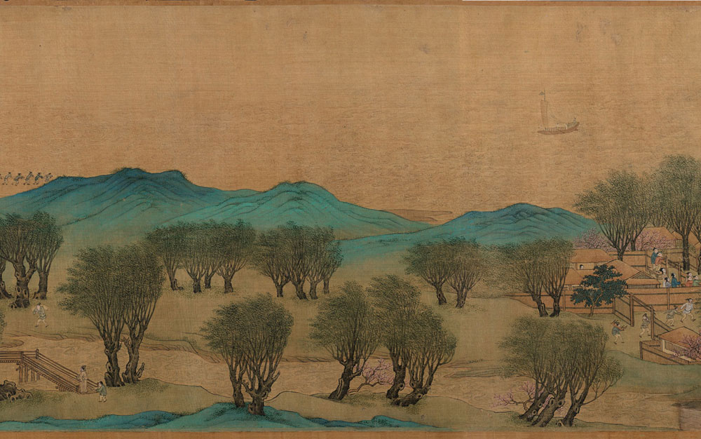 明代仇英的《清明上河图》采用青绿重彩工笔,描绘了明代苏州热闹的市井生活和民俗风情,该画长达9.87米,高0.3米,画中人物超过2000个。天平山、运河、古城墙,当时苏州地区标志性建筑皆清晰可辨,整个画卷充满山清水绿之明媚。