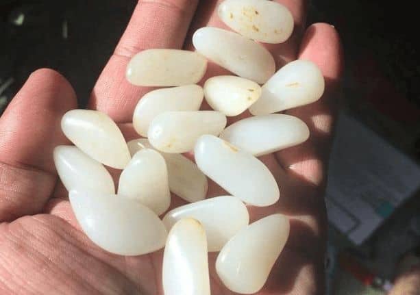 其次看净度,天然和田玉籽料通常洁白无瑕,黑点或其他瑕疵较少,而高仿和田玉籽料是用廉价玉石制作的,玉石的瑕疵比较多,即使经过了酸洗注胶等处理,经过一段时间后,这些瑕疵还是会暴露出来,而商家常把高仿籽料上的斑点说成是天然的优点。